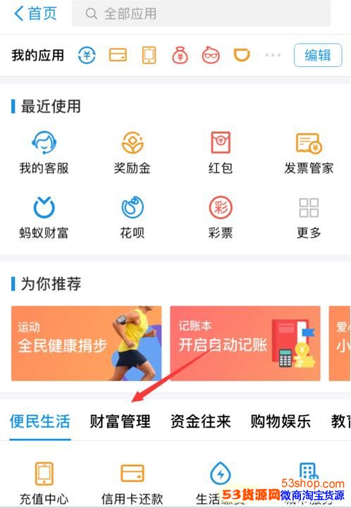 2.然后,进入之后,我们可以看到你最近的一些应用。我们不管这些,我们去下面一栏里找财富管理选项。