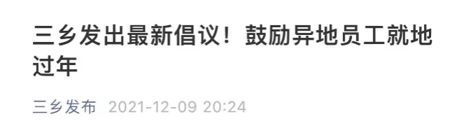 广东中山市三乡镇新冠疫情防控指挥部办公室已于12月9日向镇内企业发出倡议:广大企业要鼓励员工就地过年,形成“非必要不离广东”的共识。