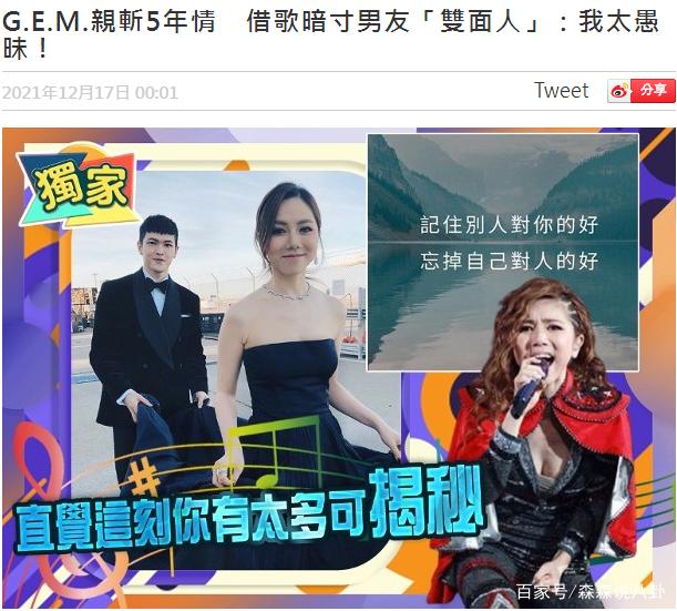 港媒日前收到爆料后,又通过邓紫棋的新歌《两个你》中的粤语歌词“直觉这刻你有太多可揭秘”、“为何熟悉你已仿佛似我幻象,怎去辨真相”等,猜测邓紫棋在diss男方。